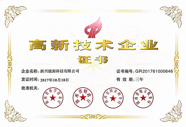 日前,新兴能源科技有限公司收到由陕西省高新技术企业认定管理工作领导小组办公室颁布的《关于公布陕西省 2017 年第一批高新技术企业名单的通知》(陕科产发﹝2017﹞203 号),我公司通过了高新技术企业认定,高新技术企业证书编号为 GR201761000646,发证日期为 2017 年 10 月18日,有效期为三年。根据《中华人民共和国企业所得税法》以及国家对高新技术企业的相关税收规定,我公司自本次通过高新技术企业认定后三年内可继续享受关于高新技术企业的税收优惠政策。