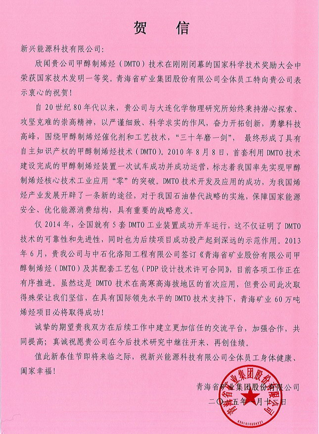 青海矿业向新兴公司发来贺信,祝贺DMTO喜获国家技术发明一等奖