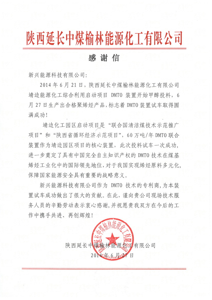 延长靖边甲醇制烯烃(DMTO)项目业主发来感谢信