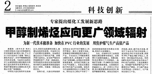 《中国化工报》在二版头条刊出了题为“甲醇制烯烃应向更广领域辐射”的文章