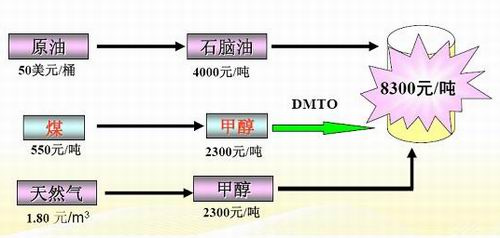 从初步的技术经济计算可以看出,在国际原油高于50美元/桶 (FOB离岸油价)下,对应的石脑油不含税价格在4000元/吨以上,导致石脑油管式裂解炉制混合烯烃的税前销售成本可在8300元/吨以上。与此对应的MTO制混合烯烃的甲醇不含税价可在2300元/吨左右,对应的由煤制甲醇的原料煤可在550元/吨左右价位,对应的由天然气制甲醇的原料天然气价在1.8元/m3。使低于此原料价位的煤基和天然气基MTO工艺有技术经济优势。